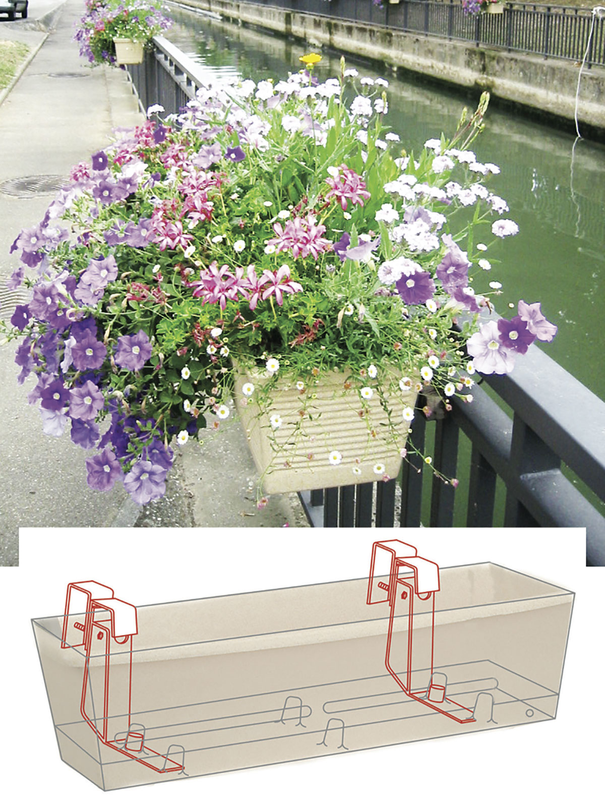 Jardinière polyéthylène pour accrochage sur barrière de mobilier urbain avec kit ferrures étriers.