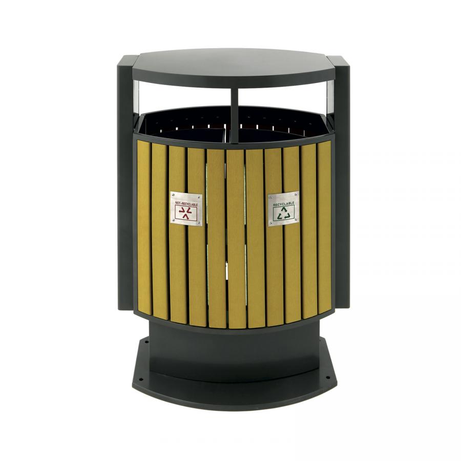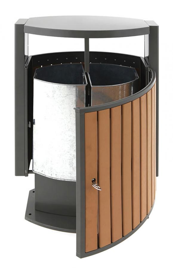Poubelle pour le tri sélectif avec lattes en plastique imitation bois qui couvrent le cadre en acier thermolaqué.